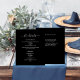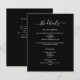 A modern, elegant wedding details/program/timeline. A black background. Personalise and add your names and wedding details. White coloured letters.