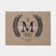 Elegant and stately black wheat laurels circular badge with monogram letter and family name in the centre over a faux burlap background design.