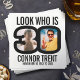 Thirtieth birthday two photos look who is 30 party napkins. Simple black and white graphic design with two photos, great for a now and then photo opportunity to add fun to a 30th birthday party. Personalise with your own two photos in the 3 and 0 and add in your own name and birthday dates. Other matching items and colour options are available. Graphic design by Sarah Trett exclusively for www.mylittleeden.com