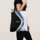 A personalise tote bag with a sleek modern look, this design has metallic curves in blue, silver and grey in a curved pattern with a black and white background. Personalise with your monogram, name or other desired text.