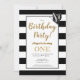 A modern black and white 1st birthday party invitation with black and gold text and a black butterfly embellishment.