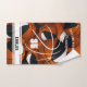 This hand towel for a basketball player features easy-to-personalise athlete name and jersey number plus team name overlying the background image of a bunch of randomly arranged basketballs - each of the basketballs has two recolored panels--one black and one white - the minimalist image of a basketball (as represented by its seams only in white) is centred on the towel - the team mascot name can be personalised on white horizontal varsity stripes at the bottom edge of the towel - background is customisable basketball-orange - by katz_d_zynes
