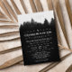 A memorial invitation featuring a black and white photo of a flock of birds over sunlit tree tops of a pine forest. Add the invitation wording against a dark background.