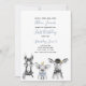 Your baby boy is turning one! Invite your special guests with this adorable invitation featuring hand drawn farm animals (a horse, a pig, a cow and a chick) in black and white. Baby's name, "first birthday" and the date are in blue hand lettered script typography, and personalised in a chic modern black sans serif. The back of the card features a cute black and white hand drawn check design. Copyright Elegant Invites, all rights reserved.