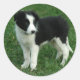 These cute canine stickers features an image of a black and white Border Collie pup standing in the green grass.