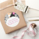 The sticker is made on wonderful paper and had no problem sticking to the bag that I purchased to put it on. I wanted to find a design that would be cute for the bride and groom and this one fit the bill as it has cute "bees" buzzing around and the wedding was taking place in a town called "Bee Cave". The packaging was great and protected the stickers. The website is easy to navigate and there are so many color choices. I had no problem finding a color that the bride was using on everything else selected. The design was adorable and there were many to choose from. You can make the figure as larger or smaller and you can place the photo and writting whereever you want to in the sticker. The printing is fabulous..better than expected.