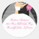 The sticker is made on wonderful paper and had no problem sticking to the bag that I purchased to put it on. I wanted to find a design that would be cute for the bride and groom and this one fit the bill as it has cute "bees" buzzing around and the wedding was taking place in a town called "Bee Cave". The packaging was great and protected the stickers. The website is easy to navigate and there are so many color choices. I had no problem finding a color that the bride was using on everything else selected. The design was adorable and there were many to choose from. You can make the figure as larger or smaller and you can place the photo and writting whereever you want to in the sticker. The printing is fabulous..better than expected.