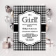 It’s a girl! Black and white buffalo plaid baby shower invitation.