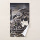 A black and white Tuxedo kitten is sitting with a gargoyle. Behind them is a gothic castle and dragons.