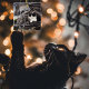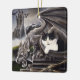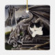 Black and white tuxedo kitten is sitting beside a gargoyle. Behind them is a castle and dragons.