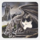 Black and white tuxedo kitten is sitting beside a gargoyle. Behind them is a castle and dragons.