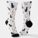 A charming pair of crew socks featuring an all-over cat and music pattern. Black and cream cats are surrounded by small guitars, drums, and treble clefs. A great addition to any novelty sock collection.