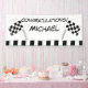 Congratulate someone for a race win with this wide banner. This banner has a black and white waving chequered flag on each end of this banner with a black and white checked border along the bottom edge. It has the customisable word Congratulations which can be changed to another message. Personalise with a name between the flags. The background is white. Its fun for a party or event for any type of race including an auto motor or motorcycle race fan or someone who has won a race, minor or big. The flag art is on a white background. Fully customisable to make it your own and for your event.