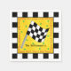 Enjoy entertaining or celebrating for a racing event or win with the chequered flag or for tailgating. These paper party napkins can be personalised with a family name that can be customied to a first name or other words. A waving black and white chequered flag is centred on a textured yellow background and has a black and white chequered border. The red words around the inside of the border and say Race Fan, Start the race and chequered flag.  Green stars are on the background. Great for any type racing - auto, motercycle, bike, derby and more. Fully customisable for a tailgate party or for entertaining to show your love of the sport. Customisable and coordinates with other accessories for a great party or event.