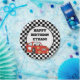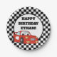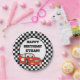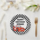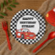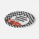 Red race car on personalised black and white chequered, child's birthday party paper plate