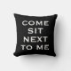 Black throw pillow cushion with a white 'COME SIT NEXT TO ME' words text print.