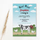 Destei's original cartoon illustration of a cute black and white cow and two chickens placed in a farm scene. The background has a red barn together with some green grassy hills and a tree. The sky is blue with some clouds. Personalise the sample text areas with the details of your event.