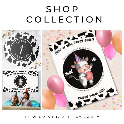 Boho first birthday party invitation with black & white cow print / animal print and a cute watercolor birthday cow wearing a party hat. Country farm animal cowboy / cowgirl design. Great for a kids party of any age. Customise the age to suit your occasion.