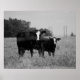 Original black and white photograph of a black cow and her small black calf standing next to her behind a barbed wired fence looking at me and the camera. We were touring through the back roads of Oklahoma and stopped next to the field for a butt break when the cows became curious and one by one wandered over to the fence to check us out. I had to snap a picture! This was taken in August of 2021. A BohippianFinch original photograph.