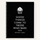 Chic recipe notebook in black and white with "good things come to those who bake" written on the cover in a modern font beneath a white cupcake with frosting decorated with little hearts. Personalise with your name.