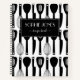 Black and white recipe book printed with a cooking pattern with black kitchen utensils adorned with little hearts. Balloon whisks, knives, spatulas, and ladles. Personalise with your name in elegant retro letters. Recipe book is written in a charming script.