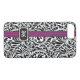 Black white damask and stylish purple band with initials floral personalised monogrammed girly custom iPhone 7 case. There is a purple stripe from top to bottom of the case and a rectangle with your initials. Personalise this case template and add you monogram or text.