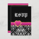 Black white damask with hot pink band & heart wedding RSVP response/reply card, featuring an elegant, stylish and romantic design of a black and white ( B&W ) floral damask pattern, a fuchsia pink band, a jewellery like heart with gold/golden outline and a vintage type font. Classic yet modern at the same time. Great for a classy winter or all seasons wedding, not just for Valentine’s Day. Note that the heart is an illustration.
