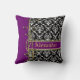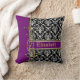 Black white damask pattern with gold floral border and purple band custom decorative American MoJo throw/toss pillow. An elegant, classy black white damask design, with a gold floral border, a purple band and names (hers and his). Modern with a vintage/retro feel.