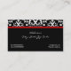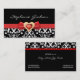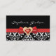 Black white damask pattern with red bow and jewel business card template that features a black and white damask pattern and a red ribbon across it with a bow and a heart shaped jewel also in red with gold outline and strass which adds a little bling. Note the bow and the heart diamond jewellery is a "printed on" illustration and not a real crystal, so are the strass. An elegant and stylish feminine business card design. Trendy, fashionable and modern perfect for professional or personal use.