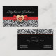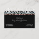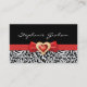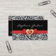 Black white damask pattern with red bow and jewel business card template that features a black and white damask pattern and a red ribbon across it with a bow and a heart shaped jewel also in red with gold outline and strass which adds a little bling. Note the bow and the heart diamond jewellery is a "printed on" illustration and not a real crystal, so are the strass. An elegant and stylish feminine business card design. Trendy, fashionable and modern perfect for professional or personal use.