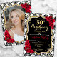 Elegant floral feminine 50th birthday invitation with your photo at the back of the card. Glam black white red design with faux glitter gold. Features black and white damask pattern, red roses, script font and confetti. Perfect for a stylish adult bday celebration party. Personalise with your own details. Can be customised for any age! Printed Zazzle invitations or instant download digital printable template.