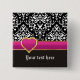 Black white damask with hot pink band and heart button, featuring an elegant, classy black white damask pattern with a modern fuchsia gradient band and magenta heart with gold outline. Trendy, fashionable and contemporary yet classic at the same time with a touch of vintage/retro feel to it. Change text with your name, monogram, initials etc. Great as a Valentine's Day, wedding, engagement, birthday or anniversary keepsake gift.