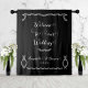 A beautiful white on black "Welcome To Our Wedding," tapestry sign featuring a lively swashed white calligraphy font on a solid black background embellished with white acanthus leaf swirls.