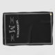 Black and white golf towel printed with your last name in an arch over your initial and the year your family was established.