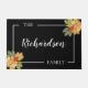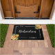 Black & White Fall Foliage Doormat: Welcome guests with understated elegance using this minimalist personalised doormat, featuring your family name or a custom message in an elegant white script. The personalisation is beautifully framed within a sleek white border set against a bold black background. Clusters of watercolor fall leaves in warm autumn hues, such as burnt orange, golden yellow, and rich red, gracefully overlap the frame in the upper right and lower left corners, adding a subtle yet inviting seasonal touch. Perfect for adding a chic, fall-inspired statement to your entryway, this modern fall doormat combines clean lines and nature's beauty, offering a stylish and sophisticated welcome to your home.