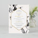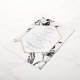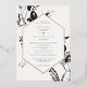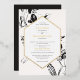 A sophisticated and exquisite floral wedding invitation with a background of beautiful and delicate black and white flowers, accented by a real foil geometrical frame presenting your wedding ceremony details in dark grey serif fonts and the bride and groom names and wedding date in real foil, for a romantic yet modern and stylish look.