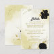 Beautiful wedding details enclosure card featuring black and white flowers and gold leaves .