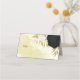 Beautiful wedding place card featuring black and white flowers and gold leaves .