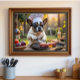This charming image features a black and white French Bulldog, sporting a crisp white chef's hat and apron, diligently grilling a sizzling steak outdoors. With a focused expression and a knife/fork utensil in paw, the adorable canine chef tends to the meat over glowing embers, while warm sunlight bathes the scene. Bottles and garnishes are visible on the rustic table, creating an inviting backyard BBQ atmosphere.
