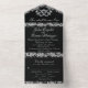 Black & White, Glitter Border & Double Hearts All in One Invitation. Romantic wedding themed all in one invitation features an elegant black pearl inside background, white pearl outside background, glitter borders, linked delicate silver scroll hearts and elegant script. Perfect for the simple to most elegant wedding. Also available with different coloured backgrounds for your wedding theme colours.