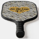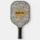 This modern pickleball paddle has a black and white diagonal striped pattern with small gold dots overtop with a large central gold heart with black customisable lettering on the front and back. The front side says, "For the Love of it!" and the back says, "Paddle Pro" but you can change either side to say whatever you want them to. Email niteowlstudio@gmail.com with any request for changes.