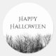 Black and white Halloween Round Sticker, with a gothic woods and typography design. With black and white customisable lettering, you can add your own information. Great for adding a spooky touch to your autumn cards, gifts and invitations.