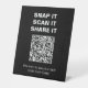 Modern black and white graduation party tabletop sign with text "Snap it, scan it, share it. We want to see your best shots from today." Contact me for assistance with your customisations or to request additional matching or coordinating Zazzle products for your graduation.