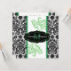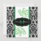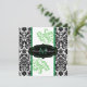 This dramatic monogrammed black and white damask wedding invitation has accents of green scrolls and a green monogram on a central black label. This invitation would be perfect for a spring, summer, fall, or winter wedding, and would also work well for other formal events requiring class and taste. It is shown here on basic paper. Linen paper would also be nice, but if you want a heavier weight paper, I suggest the metallic ice paper, which would give it a lovely opalescent lustre. ****PLEASE note that the coloured papers(metallic silver & gold, felt, and speckled) will all alter the colours on the design. ALSO, if you re-size the invitation, or if you change fonts, or the size of the font, some of the design and/or text may get cut-off. Everything will print as you see it on your monitor. I will not see your invitation, and Zazzle will NOT correct anything (typos, alignment etc.). The text and paper is all customisable. If you need help with this invitation, please email me BEFORE you place your order. If you require any other matching items, please email your request to niteowlstudio@gmail.com.