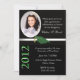 Elegant graduation party invitation done in black, with a white framed oval cut out for the graduate's photograph, in the upper left corner. A green mortarboard (graduate's cap) decorates a white line, in the middle of the card. White and green year runs vertical down the left bottom half of the invitation and the body of the invitation is done in white text. All text is fully customisable and ready to personalise for your graduates big day.