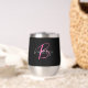 This personalised thermal wine tumbler features a monogram and first name in modern hot pink and white script on a black background.