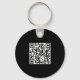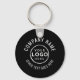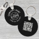Black Modern Round Business Keychain with QR Code. This sleek and minimal round keychain is perfect for professionals, entrepreneurs, and small business owners who want to share their business info on the go. The front features an all-black background with your company logo in the centre for a bold, modern look. Around the top edge, there's space for your company name or custom text, and around the bottom edge, you can add a second line like your website, tagline, or location.