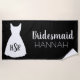 Personalised Beach theme bridesmaid gifts and favours. Silhouette of a pretty white dress against black. Script white typography reads Bridesmaid, and you can easily personalise with your bridesmaids names and monogrammed initials for your bridal party. If you would like custom colours, please contact lesrubadesigns (at) gmail (dot) com with your request.