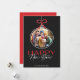 These whimsical 5" x 7" holiday greeting cards feature a photo tree ornament with a red bow. The greeting is, "Happy New Year," in black, white & red with placeholders for your favourite photo, family name(s), and year.