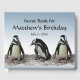 Easily personalise or remove the text on this sweet birthday party guest book which features adorable African Penguins standing on a rocky ledge against a sky blue background. They are aquatic, flightless birds whose wings have become flippers. Each has a black stripe and black spots on the chest. The pattern of spots is unique for every penguin, just like human fingerprints.